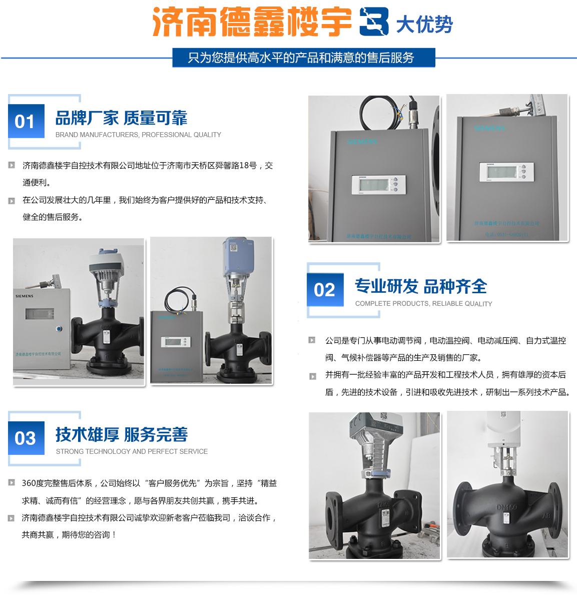 濟南德鑫樓宇自控技術有限公司是專門從事電動調節閥,電動溫控閥、電動減壓閥、自力式溫控閥、氣候補償器等產品的生產及銷售。濟南德鑫樓宇自控技術有限公司擁有一批經驗豐富的產品開發和工程技術人員,擁有先進的技術設備,引進和吸收先進技術,研制出一系列技術產品。